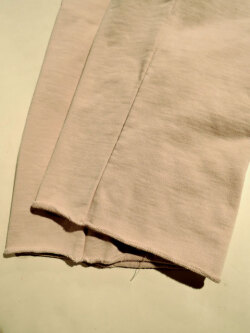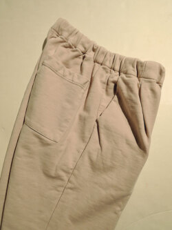 スティルオリジナルの裏毛カットソーのカットソーパンツ。この類はすぐに膝がでて寝間着同然の扱いになりがちですが、伸びがでないよう裏毛の繋ぎに特殊糸を使用してそれを回避。中肉厚のしっかりした素材のハリとフロントのタックがシルエットをきれいに魅せます。緩やかなテーパードの中太シルエット。裾は切りっ放し風になっています。お好みでロールアップも◎