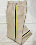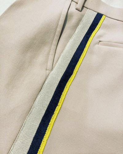 ニットメーカー【COOHEM】のオリジナルのニットテープによる側章・サイドラインパンツ。 ニットだからできる細かな柄の切り替えにブランドらしいテクニックが詰まっています。 メインボディにはくっきりとした畝の美しいウールカルゼを使用。サイドラインは光沢のあるマーセライズコットンと、ベルベットのような質感のモールヤーンを使用しています。側章・サイドラインの配色が程よくスタイリングのアクセントになる、ワイドレッグ・テーパードシルエットのパンツです。