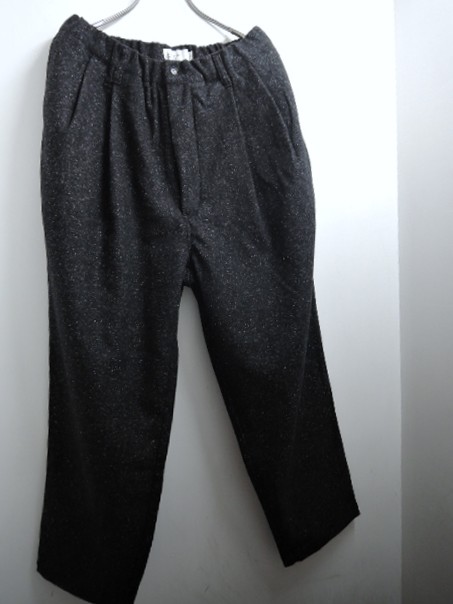 ホームスパンのような風合いが暖か味を感じる冬らしい素材のパンツです。質感は柔らかく、手洗いOKな素材。シルエットは、2タックの中太テーパード。履き心地はイージーパンツだけど、傍から見てルーズに映らない絶妙なライン。スティルらしい1本です。ウエストゴムで最小サイズの44でも、32インチを穿く方までカバーできてしまうほど。セーターやコートがとてもよく合います。