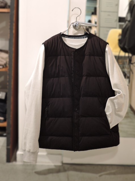 ホワイトマウンテニアリングとTAIONのコラボレーションアイテム "REVERSIBLE DOWN VEST"をご紹介します。無地面(ブラック)とオリジナルマスチェック面とでガラリと印象が変わる両A面。こちらは850フィルパワーの上質なダウンを使用することで、軽い着心地と優れた保温性を実現。 首元は使いやすいクルーネックタイプ。インナーダウンとしては勿論、Tシャツやパーカーなどの上から軽く羽織るのもおすすめです。