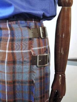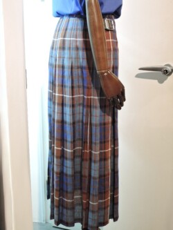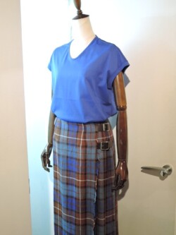 夏向けアイリッシュリネンのキルトスカート。ブルー×赤茶のマドラスチェック。一見派手に映る色合わせでも、スカートの中にある色をトップスで使うとコーディネートがまとまります。ホワイト、グリーン、レッドなども好相性。ビビットなカラーは夏の日差しとよく合います。