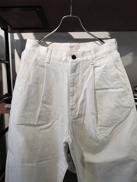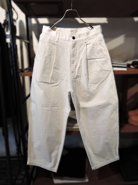 春夏に適した薄手で軽いオリジナルデニム素材の白パン。カバーオール風デニムジャケット(DN04261)と同素材になります。シルエットは、腰から膝にかけて外脇のみカーブを描いたバルーンパンツにも近しい中太のテーパードスタイル。エッジが効いてるようで、程よいスパイスがクセになると好評です。クリーンな装いが多い方こそワードローブに加えてみてはいかがでしょう。