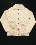 アイルランド伝統のアランセーターを、ウールとポリエステルによる素材のグラデーションでアレンジしたカーディガン。 ベースにはフランス産メリノウールを使用し、軽量ながらアランニットらしい膨らみや暖かさがあるのが特徴。 質感や、絣染めの糸で色の変化をつけてモダンなエッセンスをプラスしている。 アランニットカーディガンの元祖的な襟付きのデザインで、タイムレスで飽きの来ないアイテムです。 ※UNISEX着用モデル