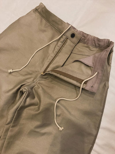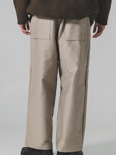 Jackman,ジャックマン,JM4586,OM Baggy Trousers,モールスキン,バギートラウザー, / 日本国内で紡績した綿100%空紡糸使いのモールスキンを使用したバギートラウザー。 肉厚でモグラの毛の様な薄らとした毛足と光沢感が特徴のモールスキン。 古来からユニフォームや制服で使用されていた素材で、起毛しながら織り上げることで生地の中に空気の層が出来、厚みと柔らかさがあるのが特長。 ウェストはゴムギャザーとドローコードでリラックス。 ワタリから裾までズドンとストレートに落ちるワイドバギーパンツとなっています。 重厚なアウターや逆にコンパクトなブルゾン・ジャケットにも、コーディネートの幅も広いトラウザーです。