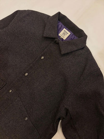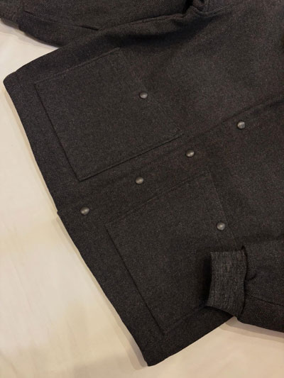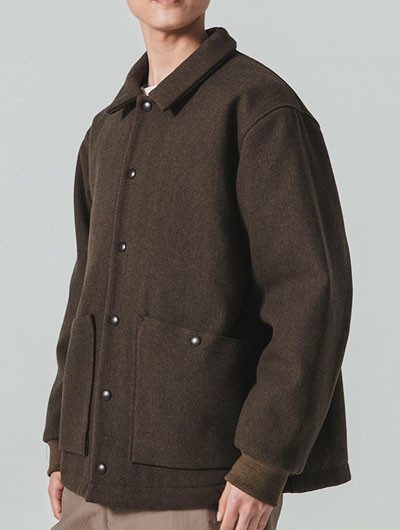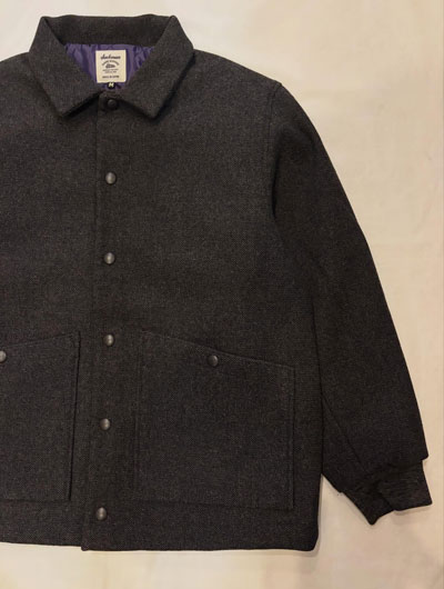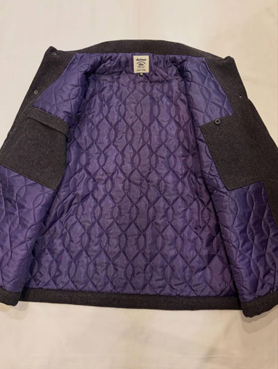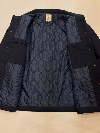 Jackman,ジャックマン,JM8590,Melton Award Jacket,メルトンアワードジャケット, / 経糸のみを二重にした珍しい二重織のメルトンを使用した中綿アワードジャケット。 数種の糸をレピア織機を使用して織り上げることで表面の素材感に奥行きを出しています。 1900年代初頭の雰囲気を出す為、縮絨はせず洗い加工のみを施すことで柔らかさと光沢感を抑えた風合いを出しています。 裏地には野球ボール柄キルトを用いて、保温性と軽さを追求した重くなり過ぎないパデッド仕様。 ボックスシルエットのステンカラーで身頃の裾にはリブが無いので、スーツジャケットの上にショートコートとしても羽織ることが出来ます。 オンスタイルからオフのカジュアルまで、1着あれば冬を乗り切れるJackman流のオーバーアワードジャケットです。