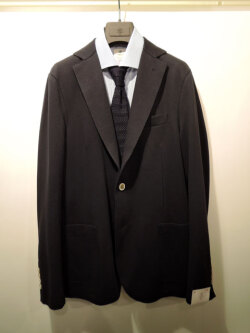 商品説明: 程よい伸縮性がヤミツキなジャージジャケット。感覚としてはジャケットよりも"カーディガン"。 裏地もなく、素材に季節感がでにくいので通年お使い頂けます。シワもさほど気にすることなくビジネスシーンやお食事、ご旅行にも適します。 また、襟裏と袖口内側にニクい演出としてベージュのアルカンターラ(高級人口レザー)が。 コート代わりに襟を立てて巻き物で色を添える なんて如何でしょうか。