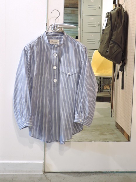 Manna マンナ【レディース】 255014 キュプラコットンローン パラシュート釦 スタンドカラーシャツ BLUE STRIPE