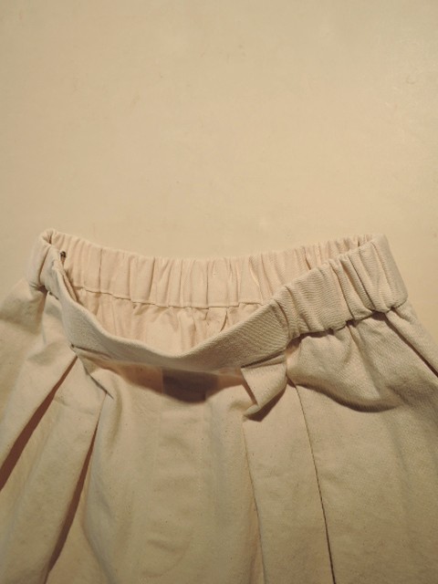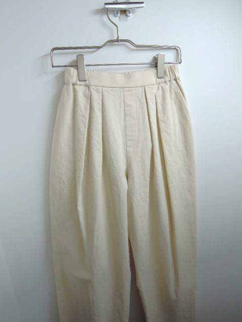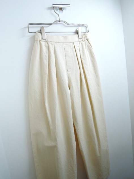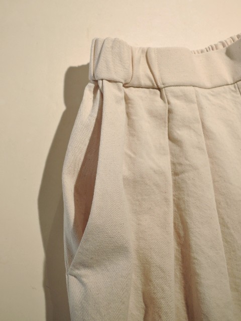 商品説明: コレクションの休止を正式発表したMannaさんのラストコレクション。肌なじみの良い生成りのデニムパンツをご紹介いたします。素材はコットン100%で、きもち薄手ながらハリコシのある質感。透け感はありません。シルエットは 2タック入りのコクーンワイド。股上が深く、ウエスト背面に平ゴムが入るイージーパンツ仕様。また、ヒップポケットを排して見た目スッキリ穿けます。洗いざらしで成立するのがデニムの強み!ブルージーンズとはまた違った合わせをお楽しみ頂けます。